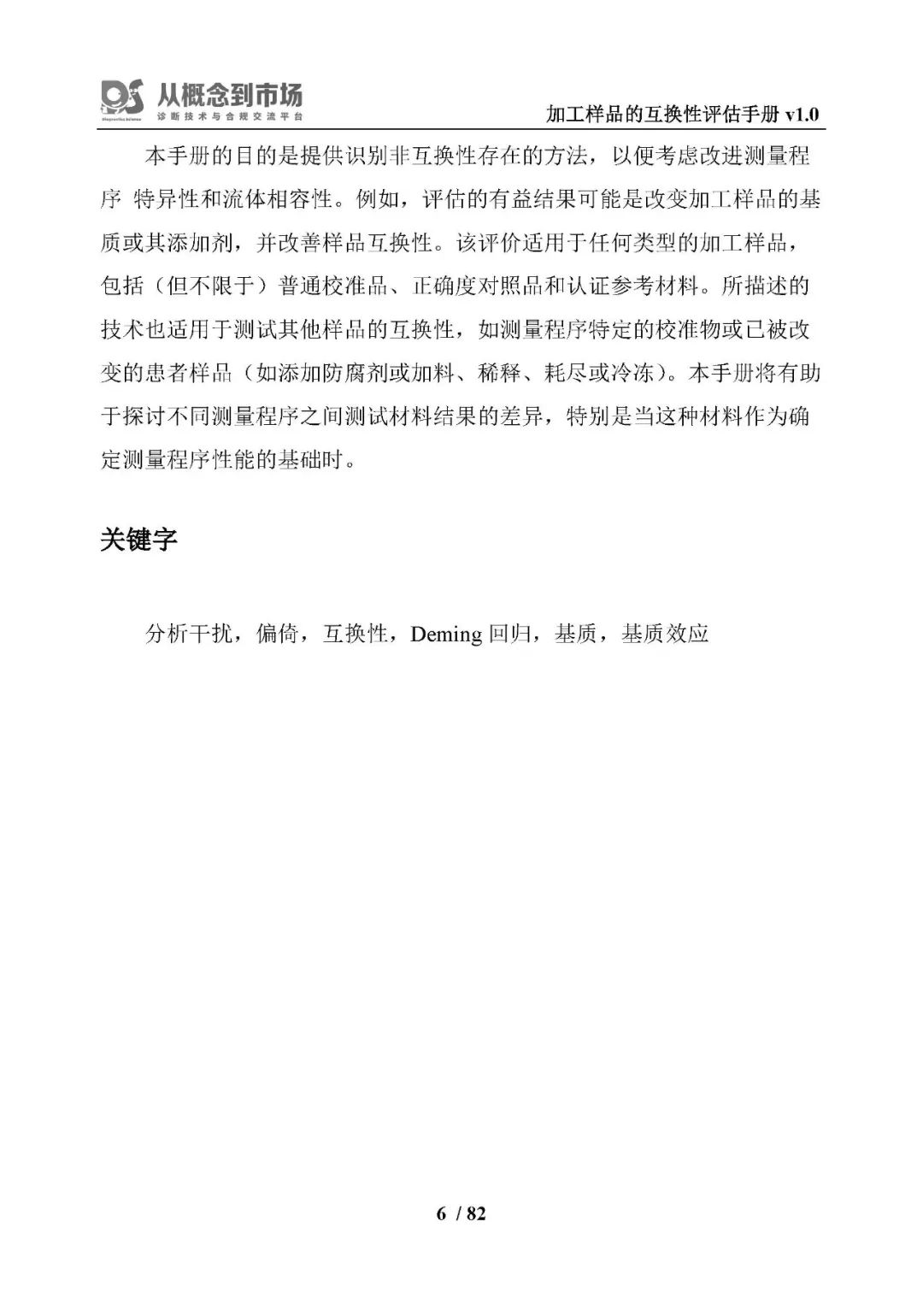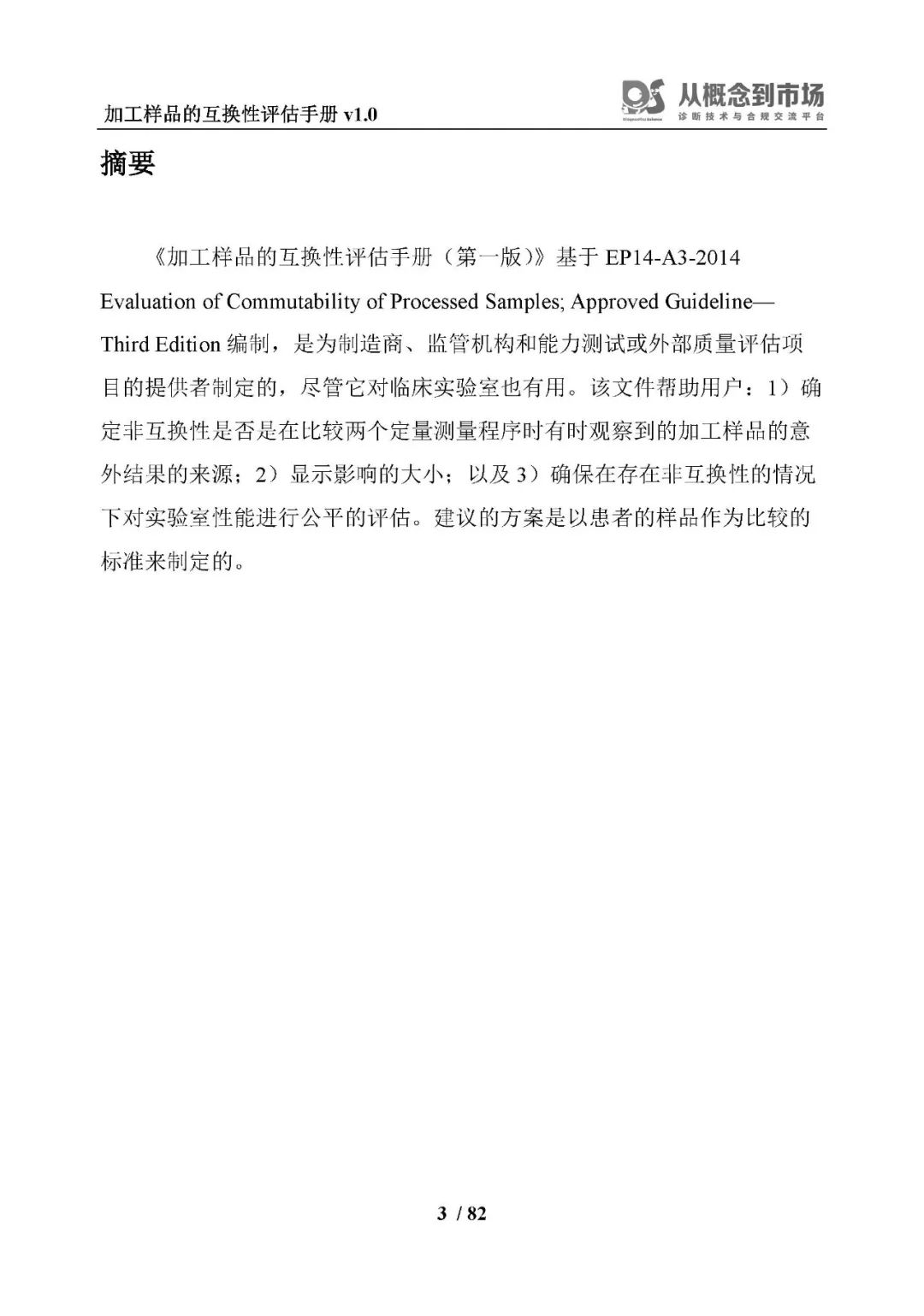 《加工样品的互换性评估手册(第一版)》基于EP14-A3-2014 Evaluation of Commutability of Processed Samples; Approved Guideline—Third Edition编制,是为制造商、监管机构和能力测试或外部质量评估项目的提供者制定的,尽管它对临床实验室也有用。该文件帮助用户:1)确定非互换性是否是在比较两个定量测量程序时有时观察到的加工样品的意外结果的来源;2)显示影响的大小;以及3)确保在存在非互换性的情况下对实验室性能进行公平的评估。建议的方案是以患者的样品作为比较的标准来制定的。