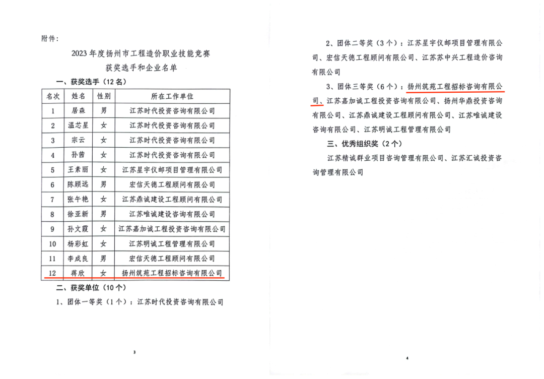 在“2023年度扬州市工程造价职业技能竞赛”中,扬州筑苑工程招标咨询有限公司荣获团体三等奖,公司员工蒋欣同志获得个人第十二名的好成绩!