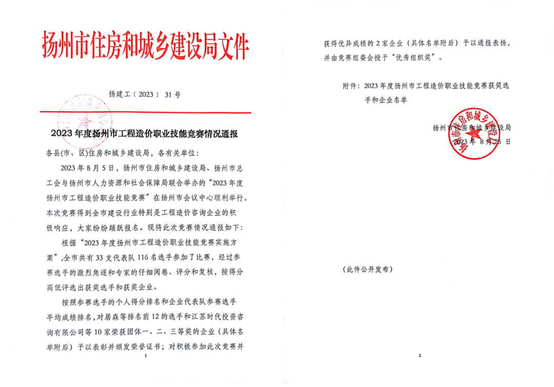 热烈祝贺扬州筑苑工程招标咨询有限公司在2023年度扬州市工程造价职业技能竞赛中取得优异成绩!