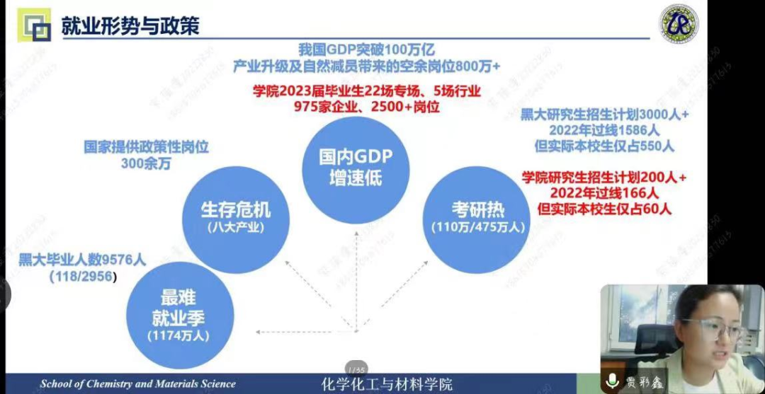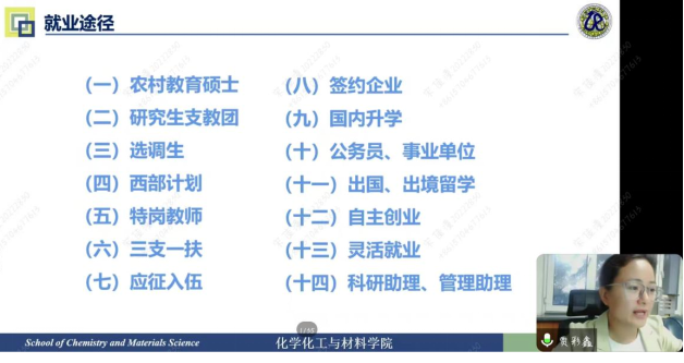 紧接着,贾彩鑫老师从毕业生就业情况、就业形势与政策、就业信息发布渠道、就业途径、就业环境五个方面进行讲解,对学院学生的求职特点、就业过程中的优势、应届生就业政策进行详细介绍,并着重强调了学生考研的院校选择、复习规划的重要性。她鼓励家长要与学生一起积极主动获取就业信息,抓住机会,帮助学生拓宽就业渠道,助力精准就业。