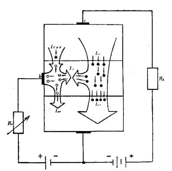 ●基区:在正向偏压下,一部分空穴向发射区注入(Ipe),一部分空穴与注入基区的电子复合(Ir),另外,有少量的少数载流子——电子在反向偏压作用下漂移运动进入集电区(-ICBO)。