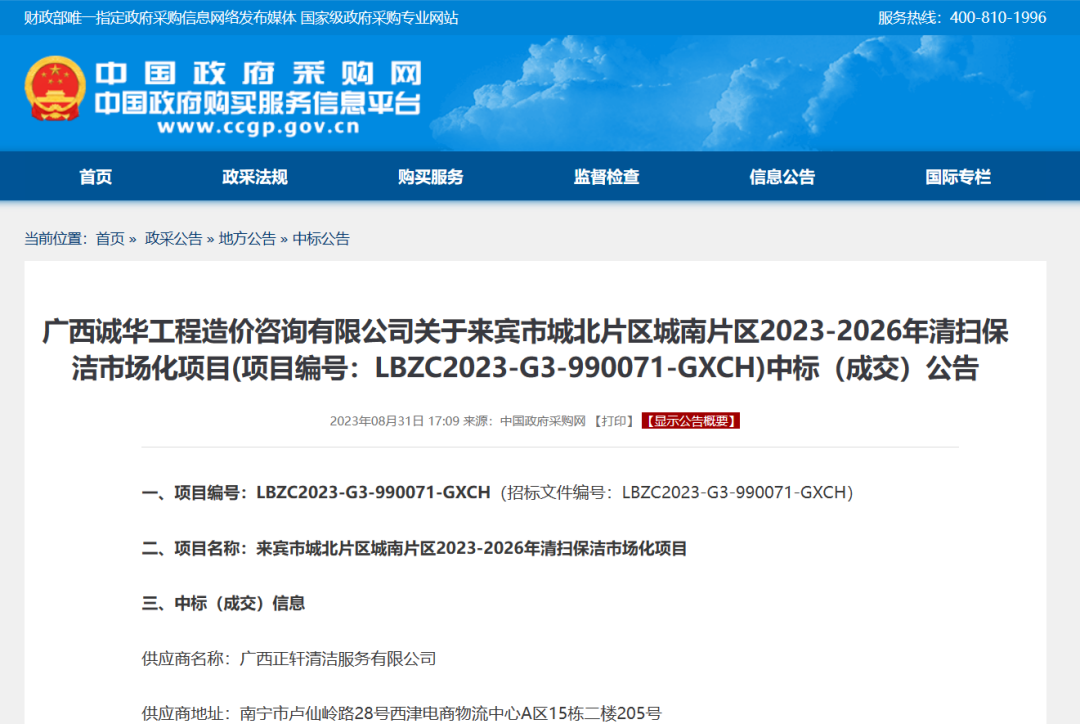 1.7亿!招标期间因投诉延期!广西来宾市清扫保洁项目开标了!