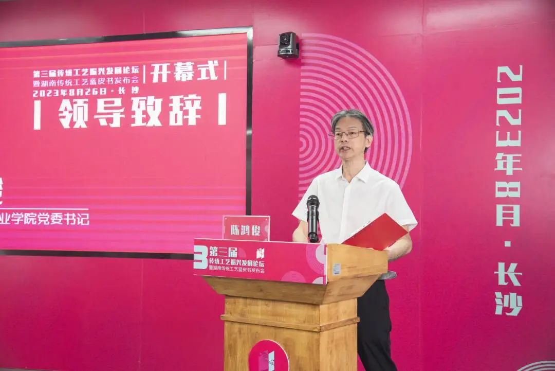 陈鸿俊在致辞中对出席论坛的领导专家表示热烈欢迎,详细介绍了学校在推动高职教育与非遗传承保护、非遗产业发展共生共荣方面取得的成绩。他表示,本次论坛是深入贯彻党的二十大和习近平总书记系列讲话精神、落实振兴传统工艺相关文件要求的重要举措,学校将继续聚焦传统工艺振兴发展,为传统工艺振兴和湖南文化强省建设贡献智慧和力量。