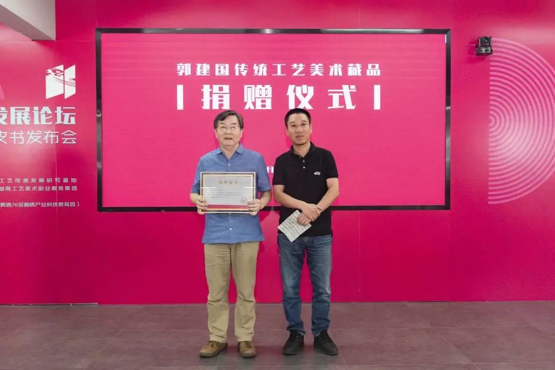 开幕式现场,郭建国捐赠了多年来潜心收集、收藏的雕花床、关公像等系列传统工艺作品196件、明清建筑木雕装饰构件等46件,展品以“木”为主,分为建筑木雕、宗教造像木雕、家具木雕三大类,再次呈现了精湛的传统技艺和厚重的历史文化。湖南工艺美术职业学院副校长刘英武为郭建国颁发了捐赠证书。