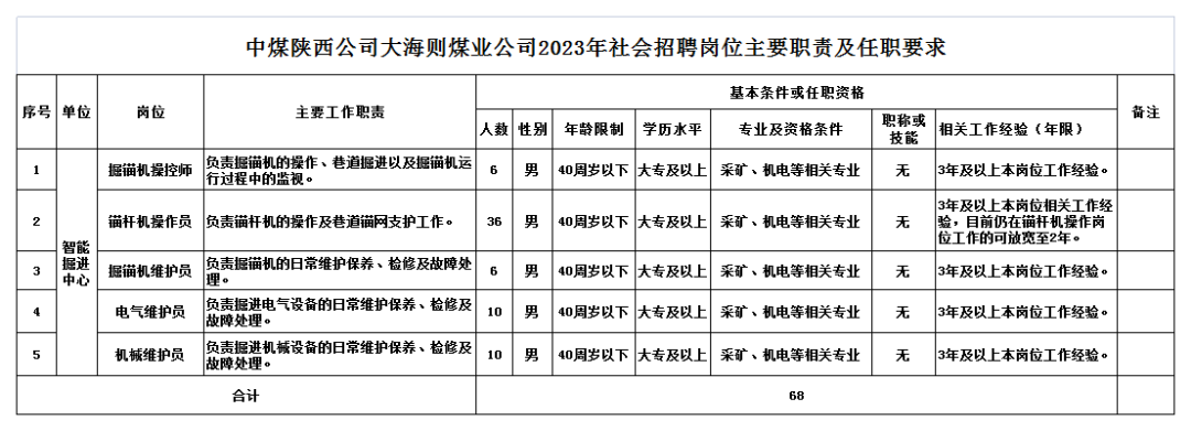 本次共招聘大海则煤业公司智能掘进中心相关岗位68人,其中掘锚机操控师6人,锚杆机操作员36人,掘锚机维护员6人,电气维护员10人,机械维护员10人,具体要求见《中煤陕西公司2023年招聘岗位及要求》(附件1)。(扫描下方二维码回复“大海则”查看)