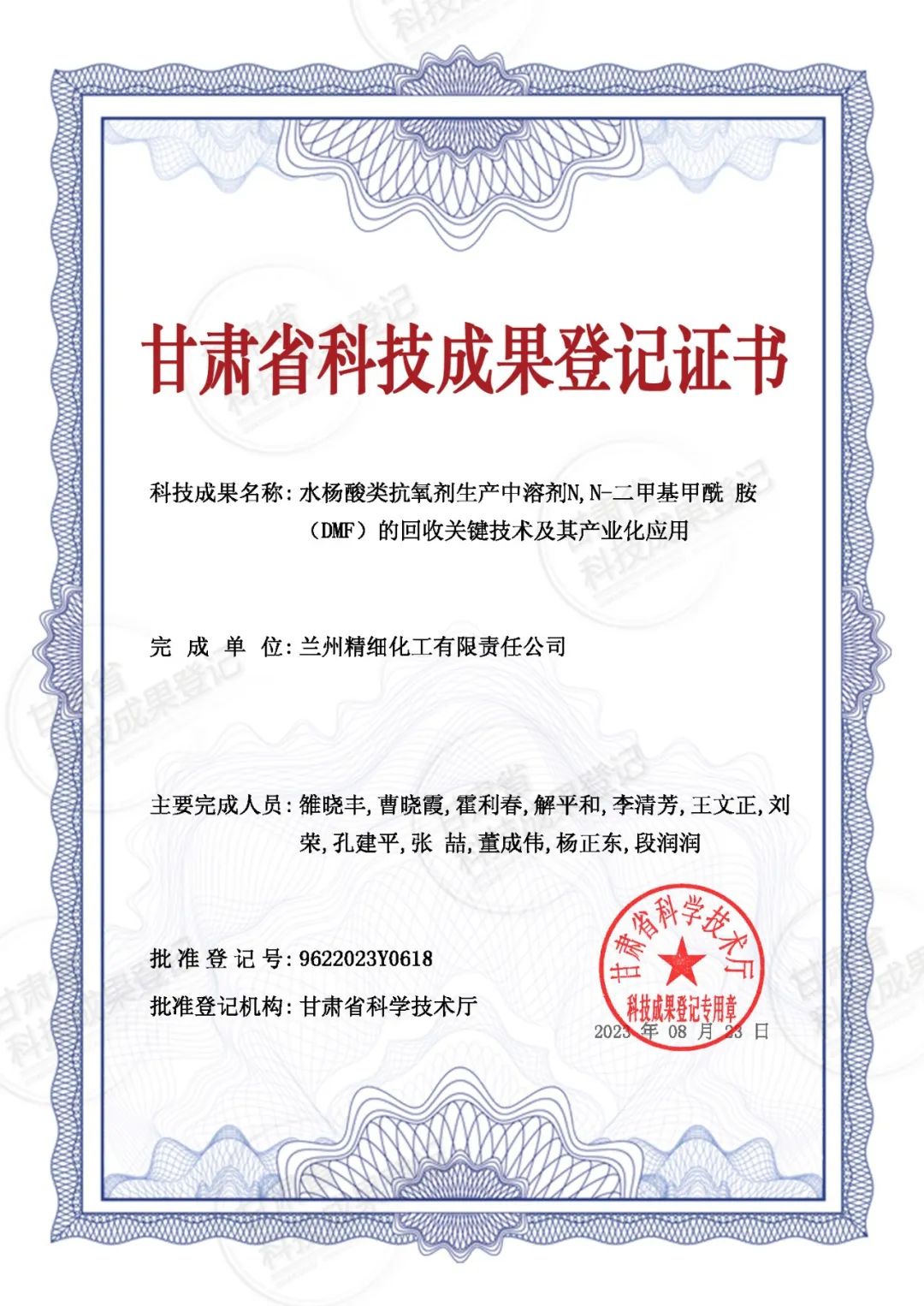 《水杨酸类抗氧剂生产中溶剂N,N-二甲基甲酰胺(DMF)的回收关键技术及其产业化应用》项目立项以来,项目研发人员通过开展一系列技术研究开发,挖掘高价值专利,先后获得发明专利1件、实用新型专利3件,荣获甘肃省科技成果奖1项,发表论文2篇。该项目的实施破解了公司中试生产工艺中产生的处理含DMF废水这一重大难题,为公司实现绿色高质量发展提供新的思路。