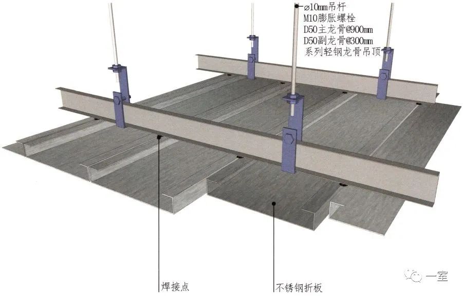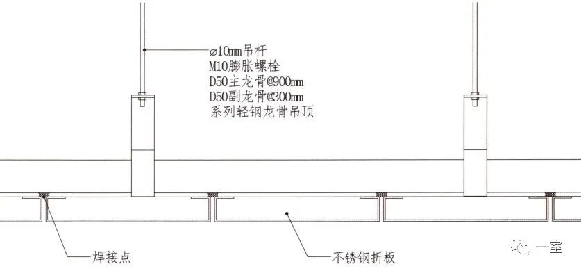 顶面除了使用频率最高的石膏板以外,还有木饰面、不锈钢等。