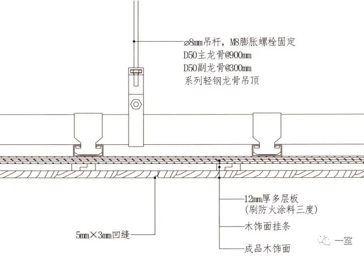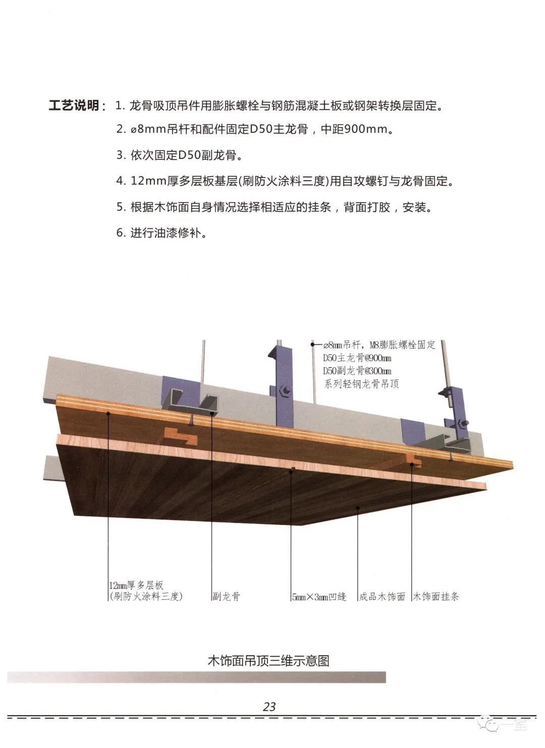 木饰面的吊顶,装饰效果强且富有个性。在施工时,需要在基层木工板上需进行防腐防潮处理,木饰面背面也需封漆。