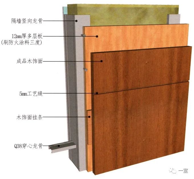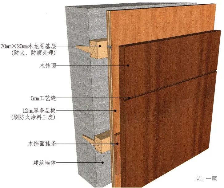 木饰面一般以人造板材为基层,经加工制作后成为装饰面板。木饰面可以采用胶粘法或干挂法,干挂法是最常见的方式,需要使用挂件来达成。
