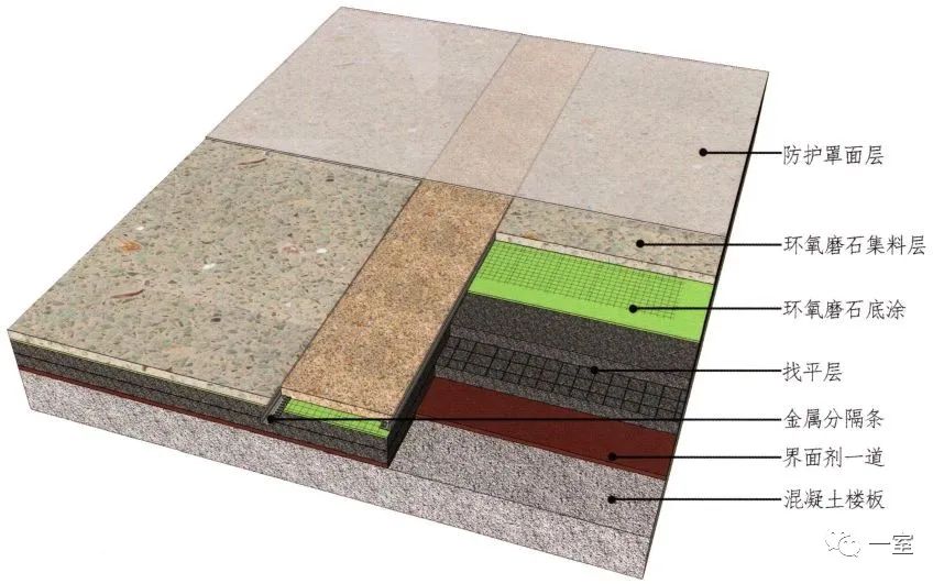 现在,环氧磨石地坪和自流平等地面涂料也是很常见的地面做法,能做出更多不同的空间地面效果,也是设计师必须掌握的。