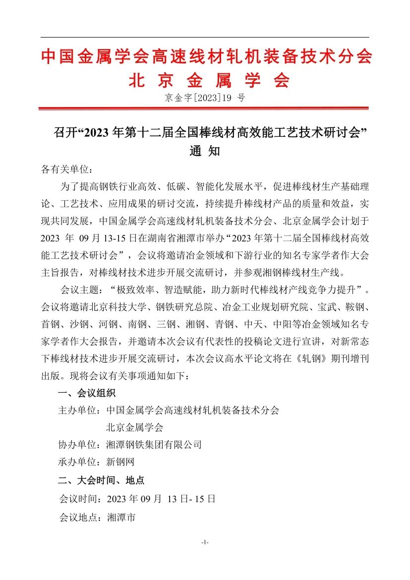 “2023年第十二届全国棒线材高效能工艺技术研讨会”通知
