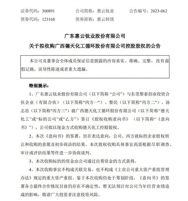 惠云钛业同时公告,为进一步拓展公司在钛白粉行业的产业布局,满足市场需求,公司拟以自筹资金收购德天化工控股股权。