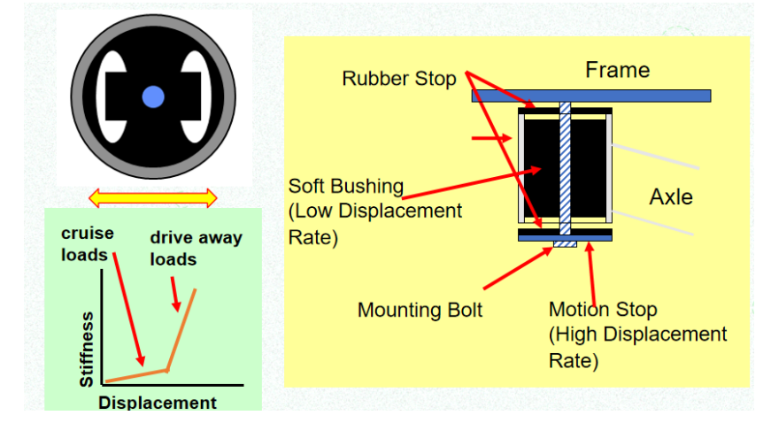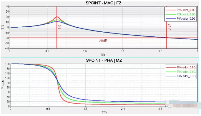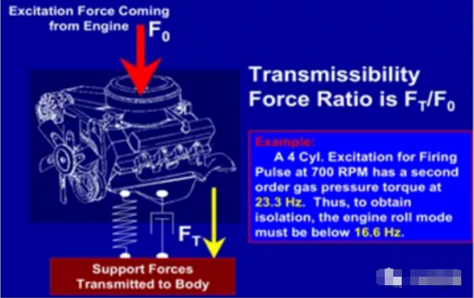 6、对于单自由度强迫振动系统在f/fn等于1.0时达到共振,此时峰值最大,其中f为激励频率,fn为系统固有频率。如某发动机二阶怠速激励频率为25Hz,动力总成bounce模态为17.68Hz,则f/fn约为1.414,此时悬置衬套具有隔振效果。要达到20dB左右的隔振,此时f/fn约为3.34左右,即动力总成bounce模态为fn约为7.49Hz。