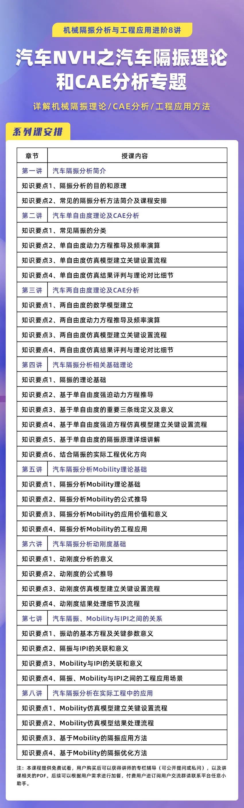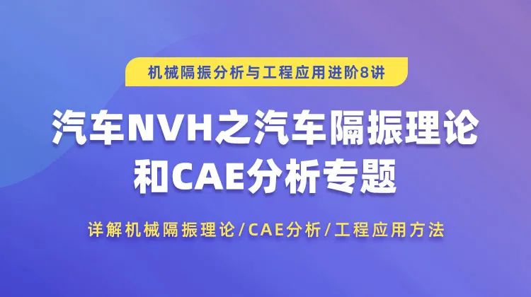 其中,隔振就是把机械或仪器安装在合适的弹性装置上以隔离振动的措施。根据激振源的不同,隔振可分为两类。主要包括主动隔振和被动隔振。其中主动隔振是指将作为振源的系统与基础进行隔离,如发动机通过悬置与车身隔离,以减少发动机对车身的影响。其目的将振源与周围环境隔开,减小力的幅值,不让激振力传递到基础上。而被动隔振主要目的是减小基础激励对系统的影响,即较小系统位移的幅值。《汽车NVH之隔振分析与行用进阶7讲》是我最新在仿真秀官网原创的视频课程,旨在分享汽车及机械隔振理论、CAE分析及应用方法,详情减后文。