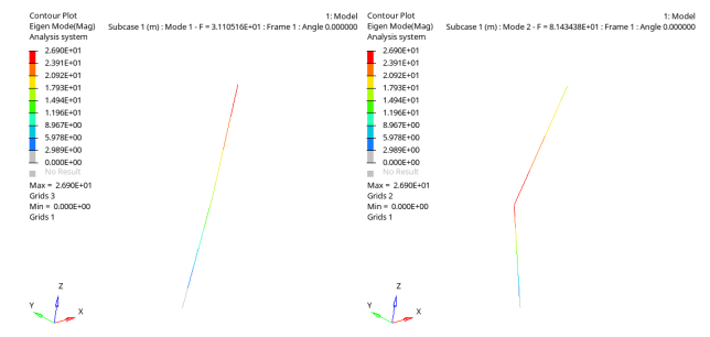 通过CAE计算,得到该系统的固有频率分别为31.11Hz和81.43Hz,由理论公式计算得到固有频率分别为31.12Hz和81.48Hz,即理论与CAE相吻合。