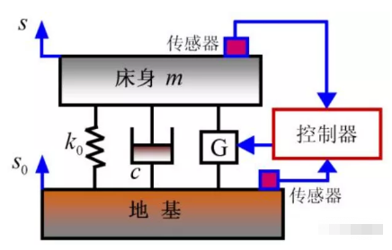 2、将作为振源的机器设备与地基进行隔离,以减少设备对环境的影响称为主动隔振,如下图所示。隔振目标将振源与周围环境隔开,减小力的幅值,不让激振力传递到基础上。主动隔振系数为隔振后传至地基的力幅值与隔振前传至地基的力幅之比。