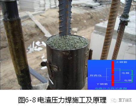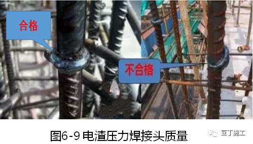 ⑹ 电渣压力焊接头应逐个进行外观检查。四周焊包凸出钢筋表面的高度应大于或等于4mm;钢筋与电极接触处,应无烧伤缺陷;接头处的弯折角不得大于4度;接头处的轴线偏移不得大于钢筋直径0.1倍,且不得大于2mm。外观检查不合格的接头应切除重焊,或采用补强焊接措施。