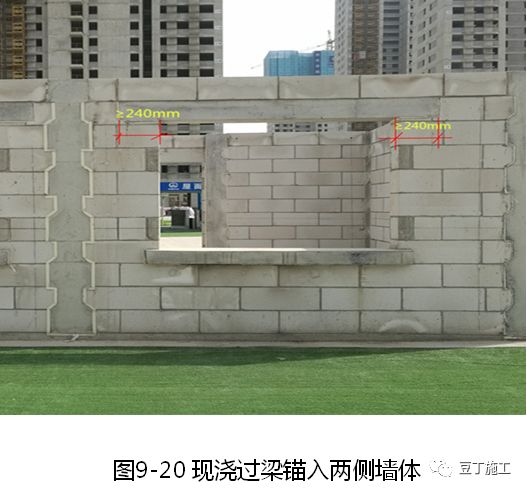 ⑹ 宽度小于1m的窗间墙,应选用整砖砌筑。砖墙中留置的过人洞,其侧边离交接处的墙面应不小于500mm,洞口顶部宜设置过梁。