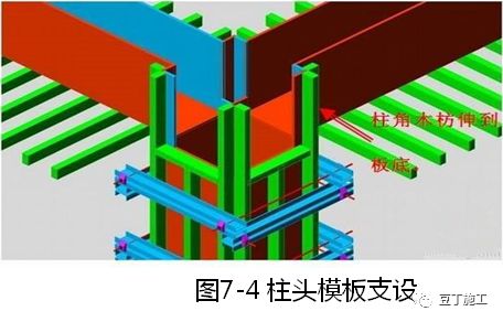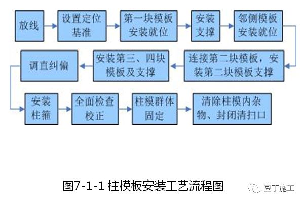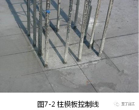 b.按图纸要求弹出横竖向轴线、柱子边线及控制线;按放线位置先钉好压脚板再安装柱模板;两垂直向加斜拉顶撑。