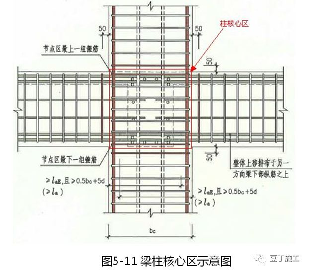 ⑷ 梁端部第一个箍筋应距离柱节点边缘50mm 处;加密长度及箍筋间距符合要求。箍筋封闭口摆放在梁顶两侧边,左右间隔摆放;箍筋与主筋应垂直。