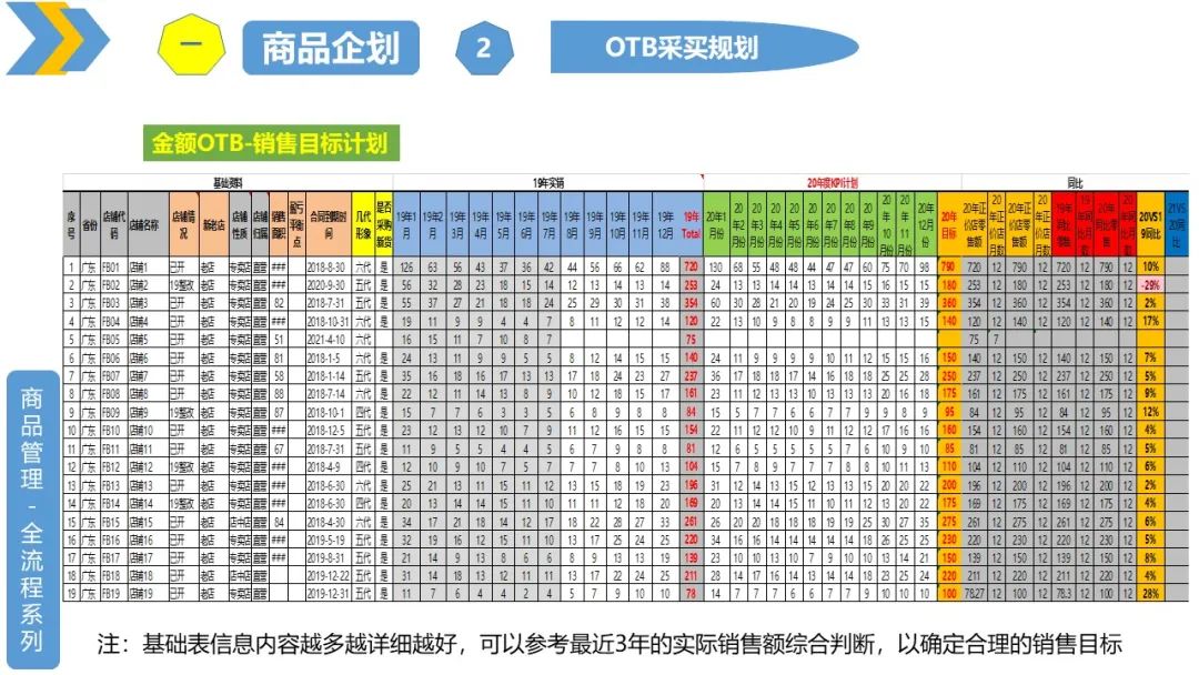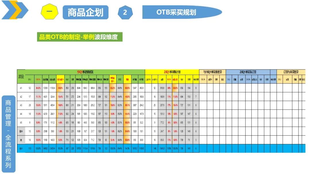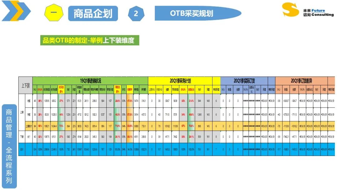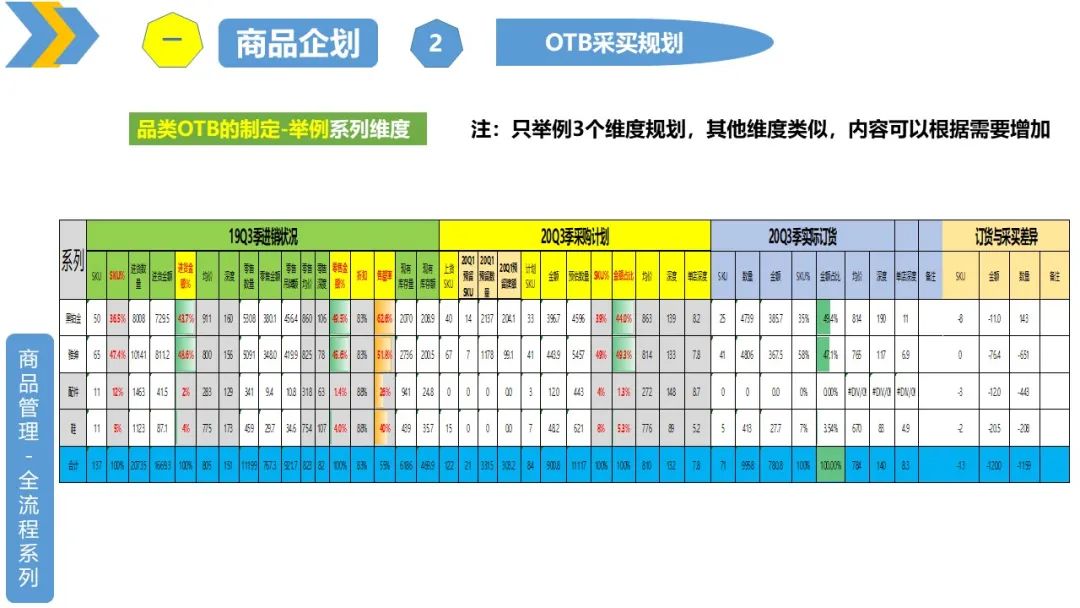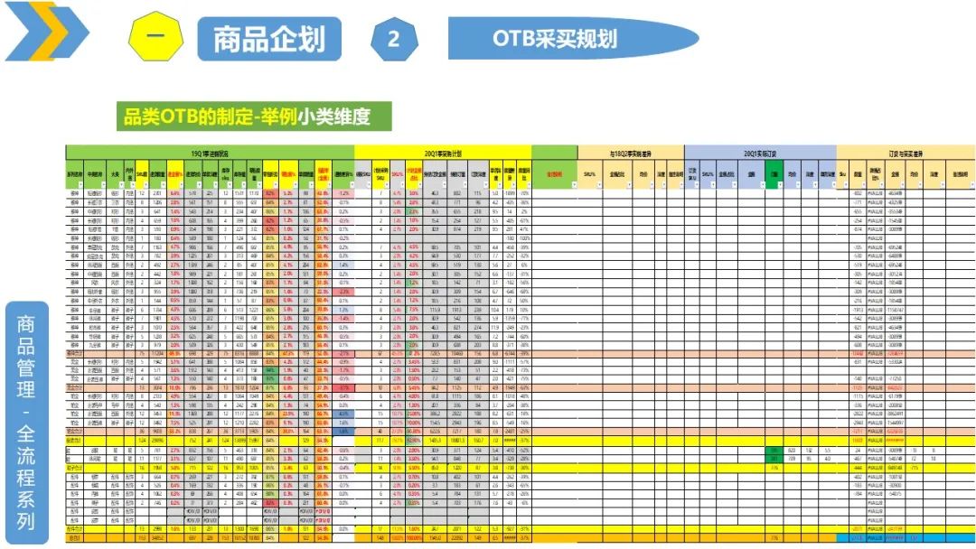 品类OTB:也就是根据要达到的销售目标,制定需要采买的新品吊牌额,并分解到各个波段、系列、上下装、内外搭、大类、小类、颜色、尺码等