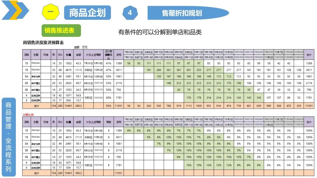 3、新品消化计划如:售罄、折扣,销量等规划(可以细分到单店,及波段、品类等)