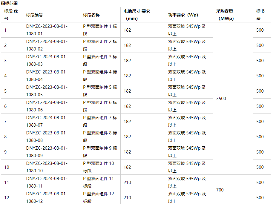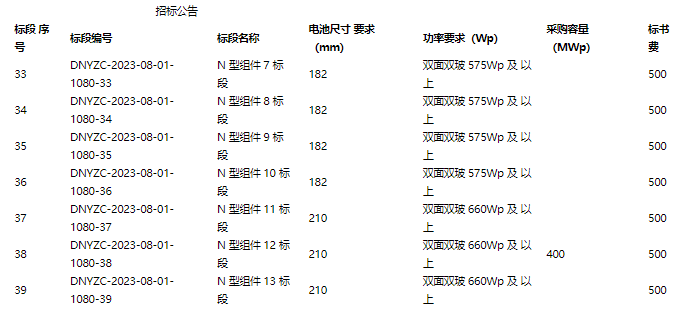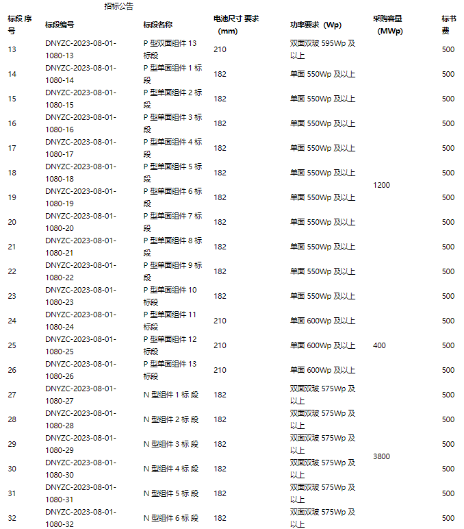 8月28日,国家电投发布二〇二三年度第五十批集中招标(第一批光伏电池组件设备、光伏逆变器)公告,采购光伏组件10GW,逆变器10GW。组件招标公告显示,标段1-标段26为p型组件,采购规模5800MW,标段27-标段30为N型组件,采购规模4200MW,详情如下: