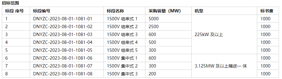 光伏逆变器招标公告显示,标段1-标段5为1500V组串式逆变器,规模8900MW,标段6-标段8为1500V集中式逆变器,规模1100MW。