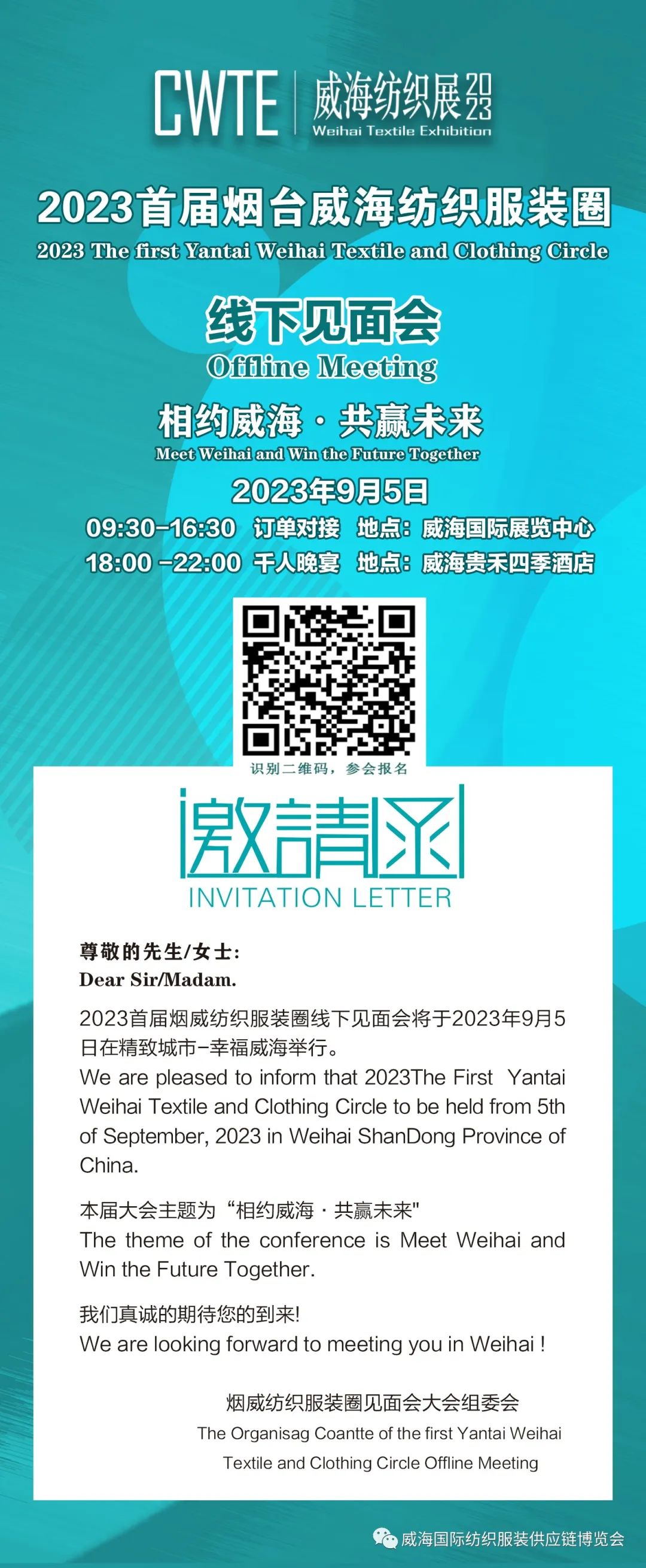 2023烟威纺织服装圈线下见面会将于9月5日在威海贵禾四季酒店召开。届时将有来自威海、烟台、青岛以及省内产业集群、浙江、江苏、上海、广东、福建、河北等全国三十余个地区近千名纺织服装展行业领军人物、外贸企业、时尚机构、产业协会、供应链企业等代表参会,共同探讨交流纺织服装产业与未来合作,威海千亿级产业集群的典范效应也将会依托大会的网络传播宣传,引发世界对威海的高度关注。主办单位:山东省纺织服装行业协会