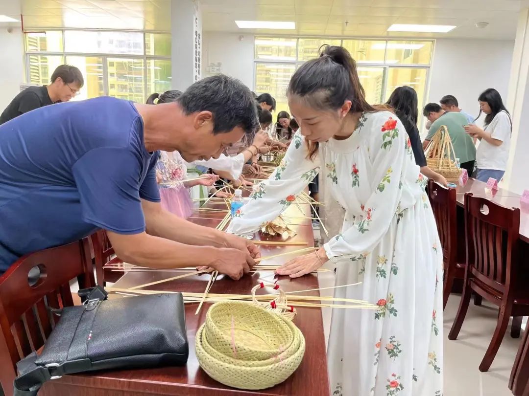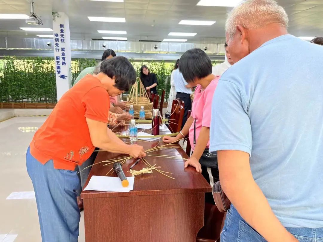 培训现场,黄水妹、杨婷2名竹编手艺人分组手把手传授竹编技艺,参加培训的学员都聚精会神地跟随师傅学习,并且踊跃动手实操。在师傅的悉心教导和学员们的刻苦学习下,一根根竹条在学员的手中成品成型,学员们都感到由衷的喜悦。