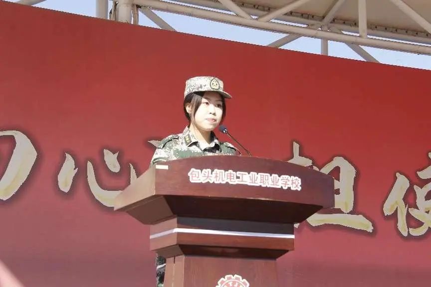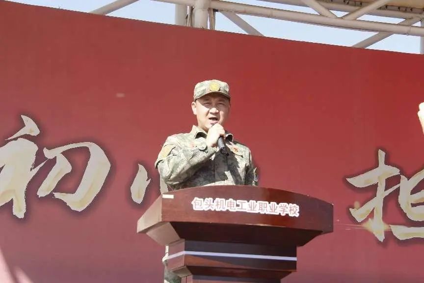 承担军训任务总教官杨海龙副营长宣布包头机电工业职业学校2023级新生军训开营。