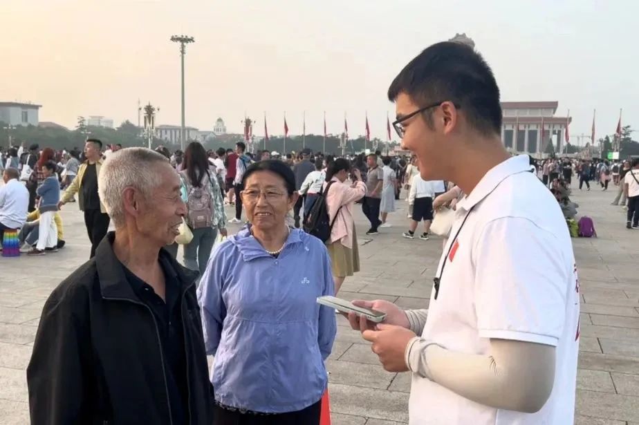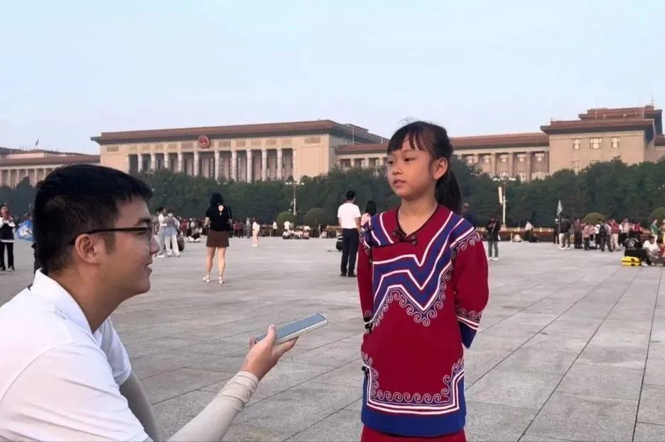 升国旗仪式承载了人们对国家的深深情感。每天清晨,都有成千上万的游客和市民涌向天安门广场,目睹这一庄严的仪式。他们身着盛装,或手持相机,或静静观看,共同见证国旗的升起。与此同时,他们眼中也闪烁着无尽的自豪与自信。在升旗结束后,实践团成员对部分观众进行了采访,最后对镜头喊出“我爱你,国旗”,表达了国人对五星红旗的热爱。
