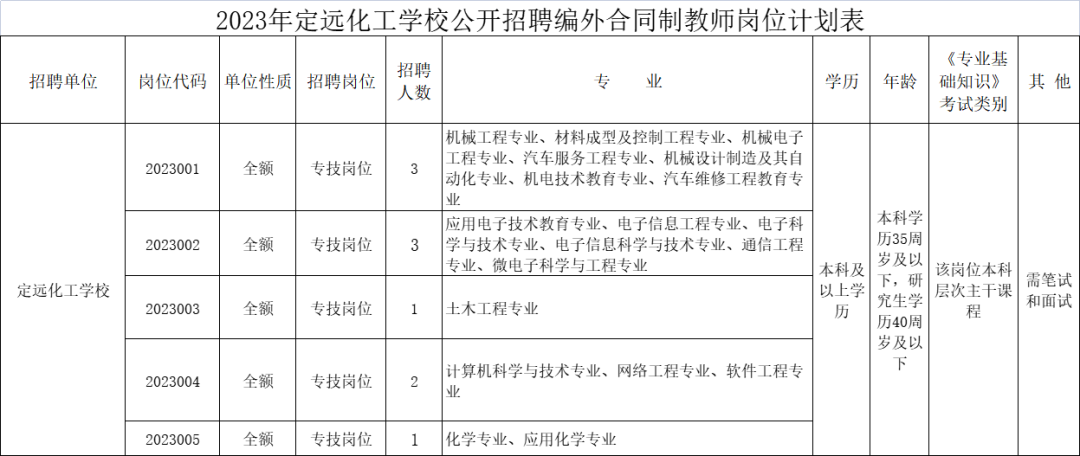 2023年定远县化工学校公开招聘编外合同制教师10名。(详见附件1:《2023年定远化工学校公开招聘编外合同制教师岗位计划表》)