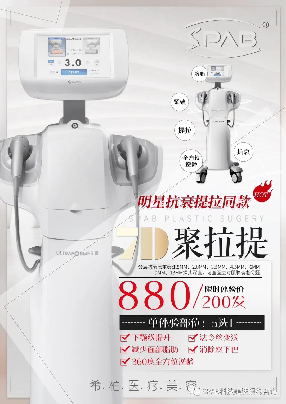 3. 7D聚拉提:7D聚拉提MAX -轻松定格时光肌 7D聚焦超声波是一种利用高科技聚焦超声声波技术进行的美容治疗,可通过超声波束在人体内部聚焦破坏毛囊组织和脂肪细胞,刺激胶原再生,从而达到减肥、塑形、紧致、提拉、消除皱纹等多重效果的美容疗法。 【针对皮肤类型】脸部脂肪量较高,皮肉不贴合而导致的下垂。