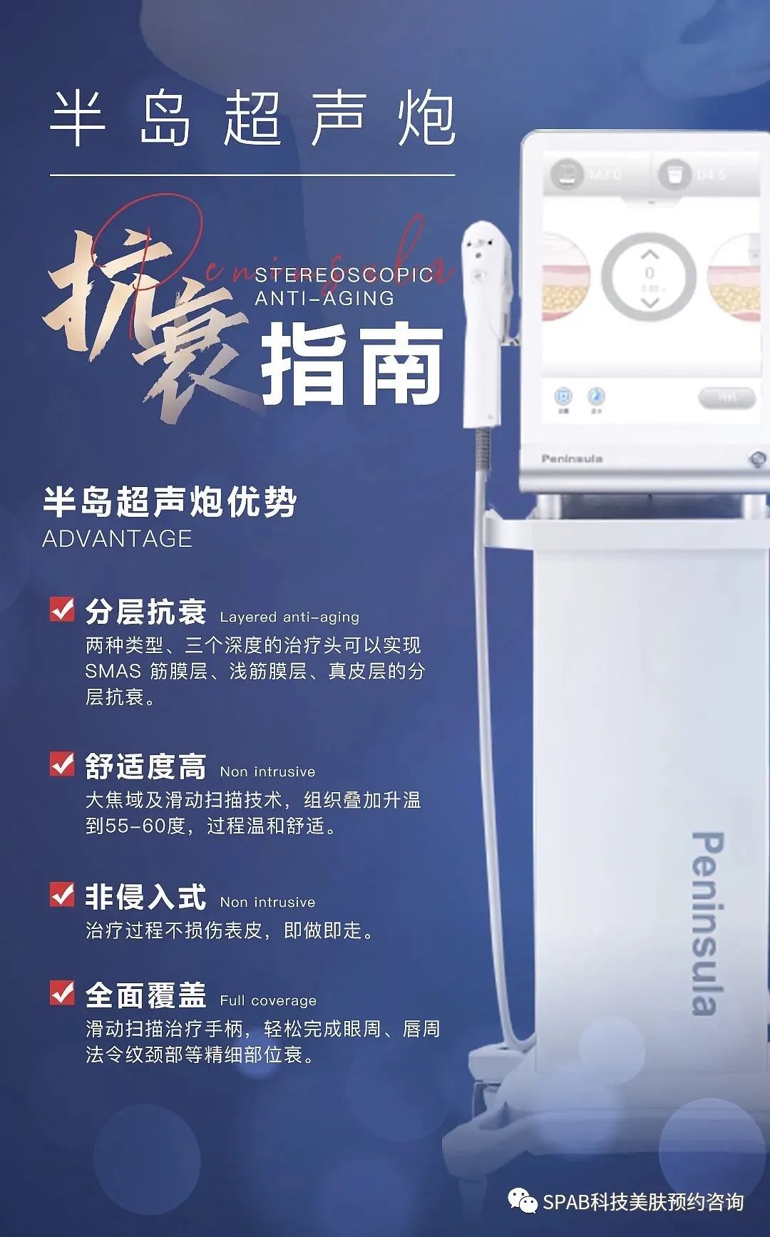 5.半岛超声炮:半岛超声炮-科普贴 半岛超声炮利用大焦域技术及超脉冲技术,在不损伤表皮的情况下,将热能作用在皮下多个层次。大焦域技术避免了单位面积下能量的过度集中,让热作用更加均匀、温和,大大提高了治疗过程中的安全性和舒适度。是国内自主研发的抗初老高端仪器。每台配有GPRS定位系统,授权医疗机构使用。