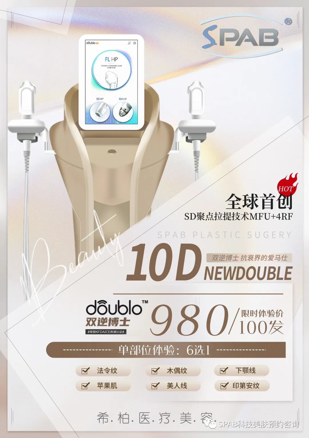 4.10D双逆博士:【科普】10D双逆博士 韩国最新进口仪器,在7D的技术应用上,增加射频的功能,眼部的探头,针对层次更精准,作用更广泛。将7D和热玛吉的完美结合。 【针对皮肤类型】同时具有以上两种皮肤情况。