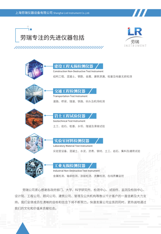 劳瑞公司总部设于上海,坐落于成熟的商业中心--万达广场,公司所有员工大部分拥有本科以上学历,大部分是有多年土木工程实践经验的工程师。同时,我公司与国内外诸多土木类大学和科研院所联系密切,聘请了多名教授为公司顾问,共同为用户提供专业的售前和售后服务。公司与同济大学和上海建筑科学研究院等检测单位专家共同对外承接各项土木工程和道桥检测。
