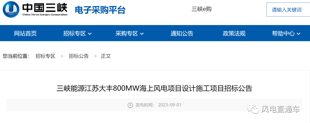 9月1日,中国三峡电子采购平台发布《三峡能源江苏大丰800MW海上风电项目设计施工项目招标公告》。