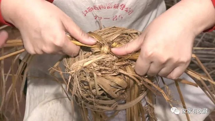 赵老师说,稻草包装用的是手腕的力量,用好了这股力量,草结才能顺力而下,更稳固地包裹住瓷器。