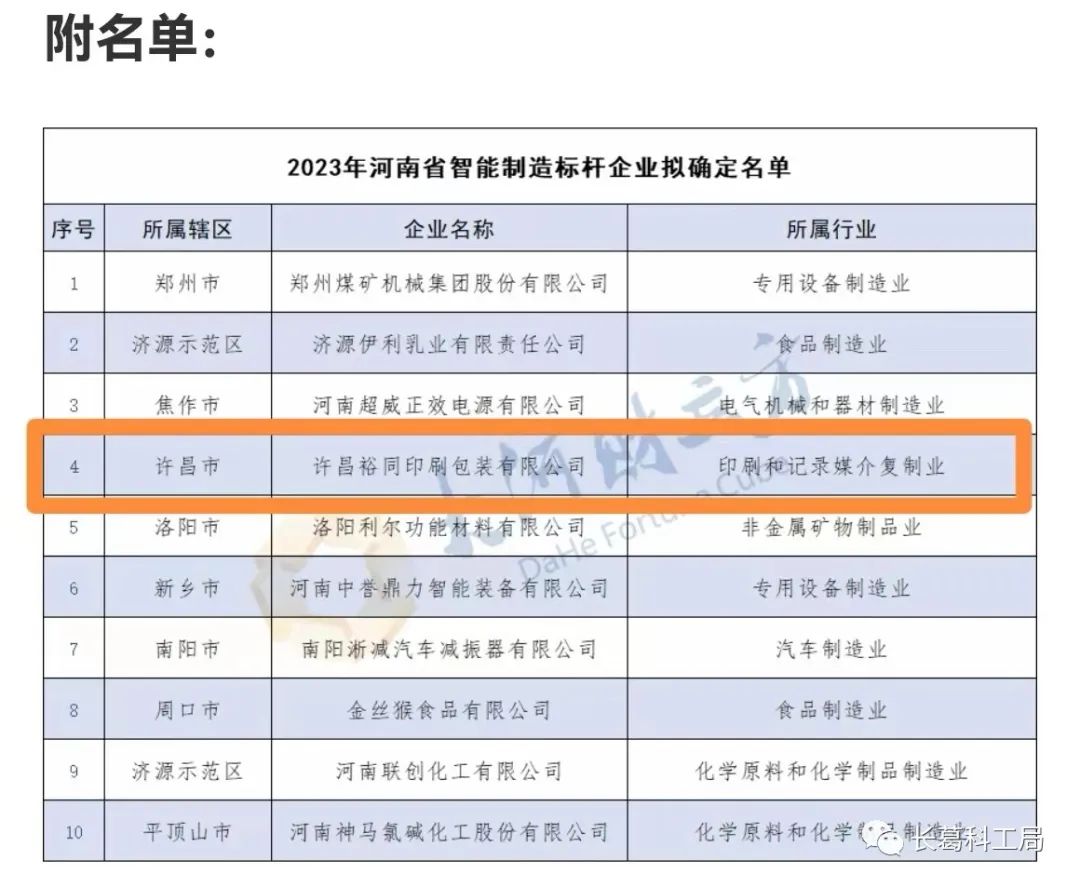 8月31日,河南省工业和信息化厅公示了2023年河南省智能制造标杆企业拟确定名单,根据《河南省工业和信息化厅办公室关于开展2023年智能制造标杆遴选工作的通知》(豫工信办数字〔2023〕123号),经各地工业和信息化主管部门推荐,省工业和信息化厅组织专家进行评审,拟确定许昌裕同印刷包装有限公司等10家企业为2023年河南省智能制造标杆企业,予以公示,接受社会监督。