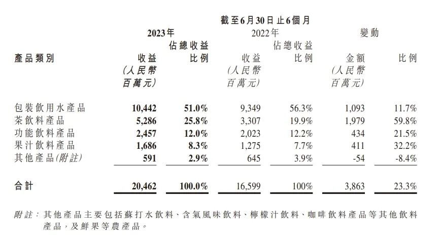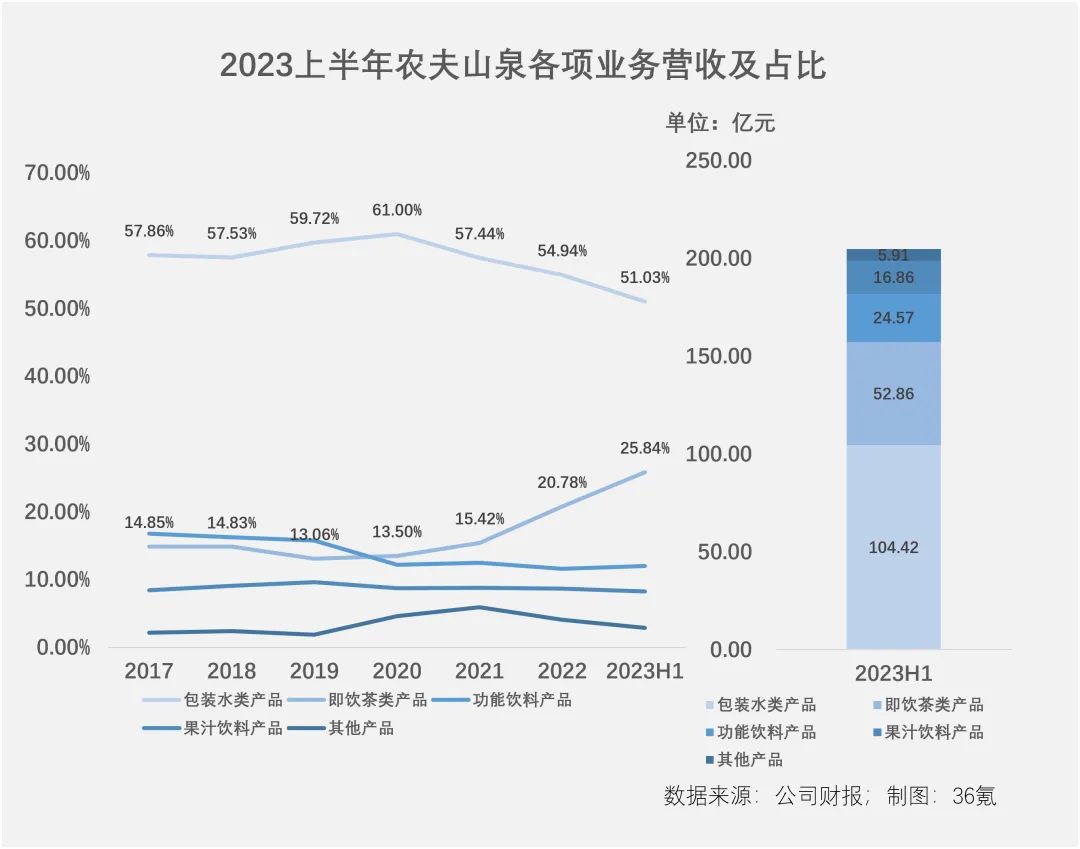 8月29日,农夫山泉公布2023年上半年业绩,营收和利润双增。截止2023年6月30日的6个月,农夫山泉实现营收204.62亿元,同比增长23.3%;净利润57.75亿元,同比增长25.3%。对比同行,农夫山泉仍然有着优于同行的增长。2023年上半年,统一中控饮品业务的营收增长了12%,而康师傅饮品业务营收则增长了不到10%。分品类来看,农夫山泉包装水、茶饮料、功能饮料、果汁饮料四个品类都在增长,其中茶饮料尤为亮眼,实现了52.86亿元的营收,同比增长59.8%。
