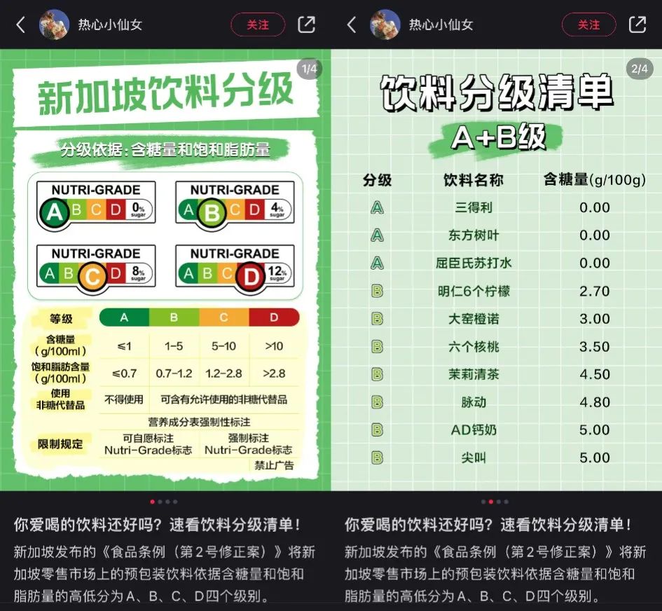 Euromonitor的数据则显示,2017-2022年,含糖茶饮已经进入低速增长,而无糖茶饮在2022年保持7.9%的增速,远高于含糖茶饮。另一个源于中金公司研究部的数据则表明,2014年,无糖茶饮在茶饮料市场的占比为1.5%,到了2019年,这个数字变成了5.2%。高增的无糖茶也让巨头们实现了好业绩。今年上半年,农夫山泉茶饮料同比增长六成,而三得利中国饮料高层此前接受采访表示,乌龙茶上半年增长约200%。无糖茶的爆发,首先得感谢元气森林做了无糖饮料赛道的市场教育。这家饮料新秀横空出世,成为引爆无糖饮料赛道的重要变量。2018年,元气森林气泡水横空出世,高举“0糖0卡”口号,只花了不到5年就达到了70亿规模,即使强如可口可乐,达到这个规模也花了15年。眼看元气森林日益长大,饮料巨头们也亲自下场卖起了气泡水,可口可乐上线小宇宙AH!HA!、农夫山泉推出汽茶和果味苏打气泡水。在饮料赛道之外,越来越多的品类也开始减糖或“0糖”了。比如以“纯植物基配方、减碳水、减能量、0白砂糖”为卖点的每日黑巧,以及主打0添加的简爱酸奶。而气泡水和无糖茶饮爆发的共同背景是,年轻的消费者越来越愿意为健康买单。一边是“抗糖计划”成了中产的新型OKR。在小红书上以“抗糖”“无糖”为关键词搜索,分别能得到36万和110万条结果。另一边则是人工甜味剂的饱受争议。上月底,世卫组织下辖机构国际癌症研究机构(IARC)发报告称目前食品工业最常用的人造甜味剂阿斯巴甜(Aspartame)“可能对人类致癌”。尽管目前尚未定论,但消息一出仍然对消费者造成了不小的冲击。引起热议的新加坡饮料分级制度,东方树叶为A级,图源小红书