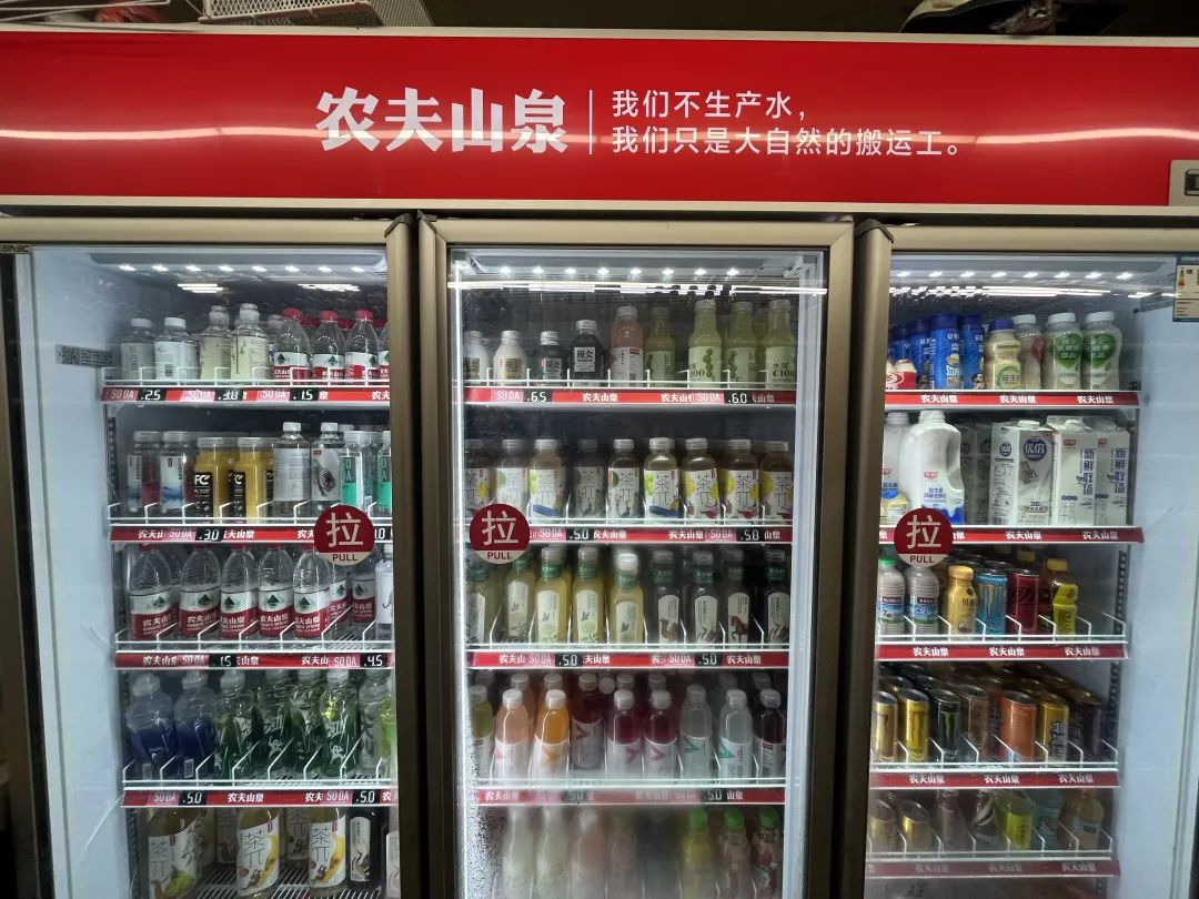 事实上,农夫山泉并非最早布局无糖饮料的玩家。早在1997年,三得利就率先进入中国市场,随后统一在2002年推出了茶里王,可口可乐和雀巢在2010年推出了原叶……但是包括茶里王、原叶在内的茶饮料都先后退出市场,三得利表现也不尽人意,在中国市场坐了近二十年的冷板凳。那个时候的茶饮料是康师傅和统一的天下,3块钱一瓶、含糖量极高、开盖还能再来一瓶的冰红茶是人们的心头好。根据前瞻研究院数据,到2019年,康师傅和统一仍然占据着茶饮料市场接近一半的市场份额。最近两年,消费者最直观的感受是越来越多的无糖茶饮料出现在了货架上,三得利乌龙茶、农夫山泉东方树叶、元气森林燃茶、让茶高山树叶……农夫山泉冰柜,现场拍摄