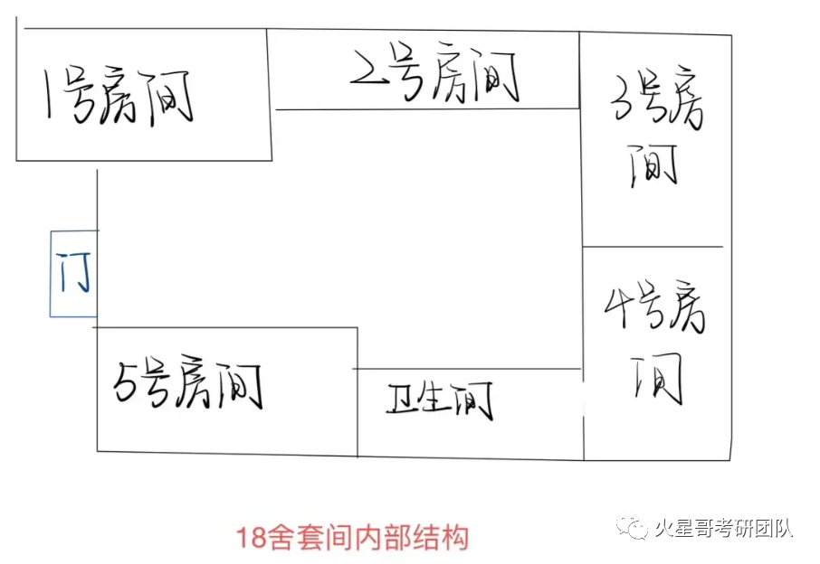 18舍是一个套间结构,每一个套间有5个房间,每个房间有5张床位,共用一个卫生间,有两到三处淋浴,内部结构可见下图.