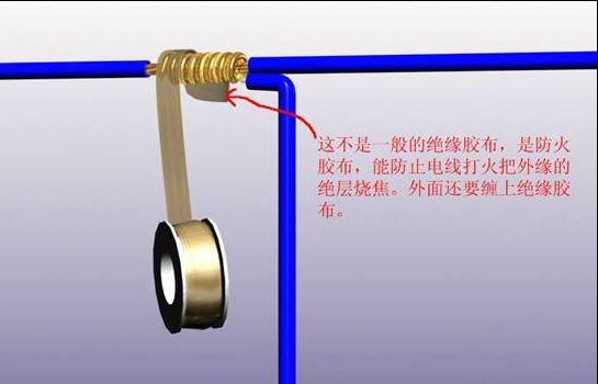 防火胶布隔离法,多用于吊顶内,或比较高能的工程中,主线不能能弄断,辅线绕主线6——8周,吊顶内的射灯,一路上要有很多灯就是这样接法,用防火胶布缠在里面,它的作用