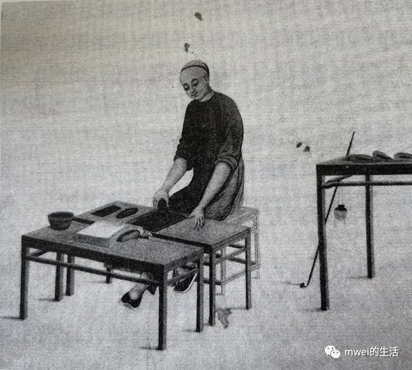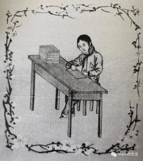 这个也是十三行的外销画,反映的是装订环节。当时都是线装书,女性从事此项工作应该是普遍现象。