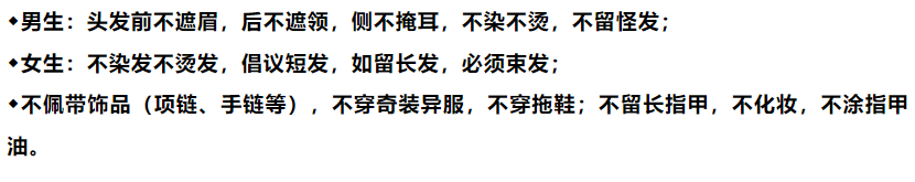所有同学不佩戴饰品(项链、玉佩、手链等),不穿奇装异服,不穿拖鞋报到。不留长指甲,不化妆、不涂指甲油。