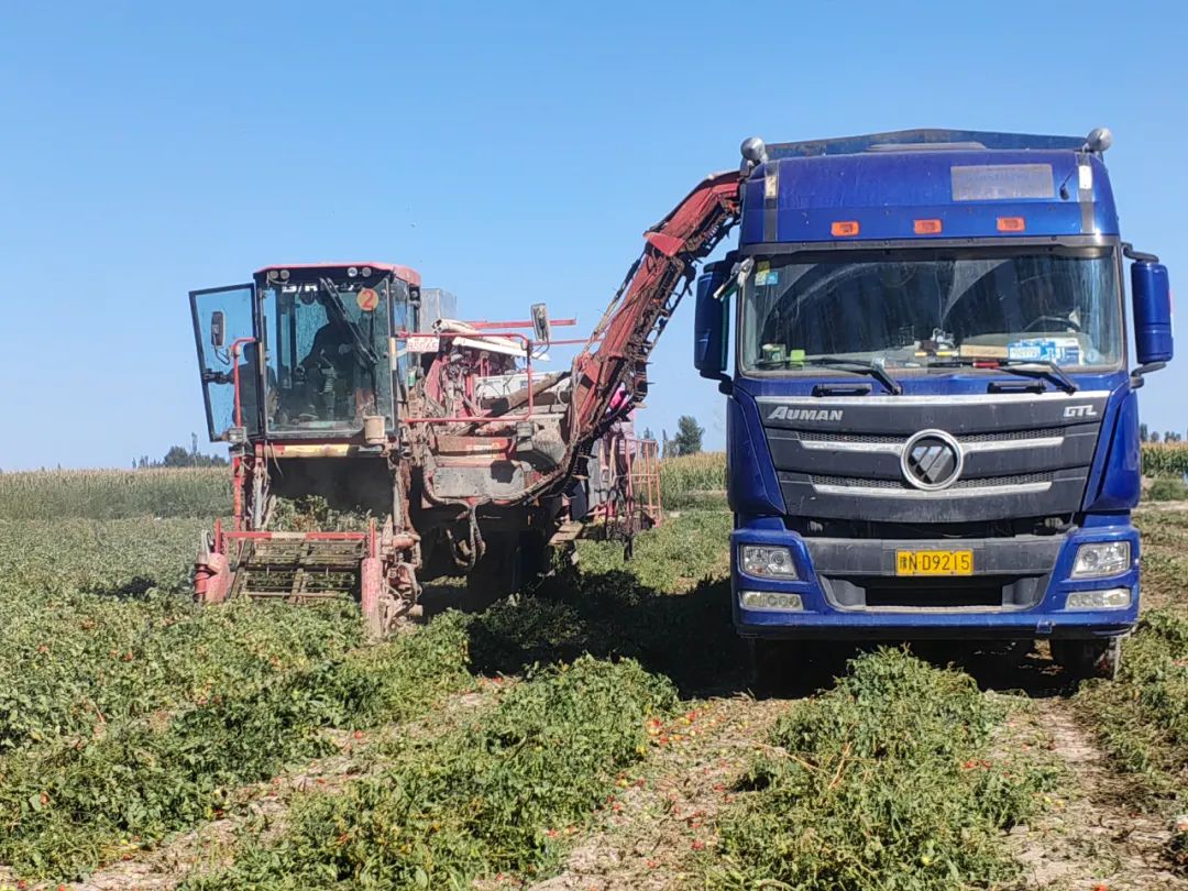 番茄采收机配合卡车不断运转,番茄被卷进采收机经筛选后,成熟的果实进入旁边的卡车车厢里,采收过程全部实现机械化。