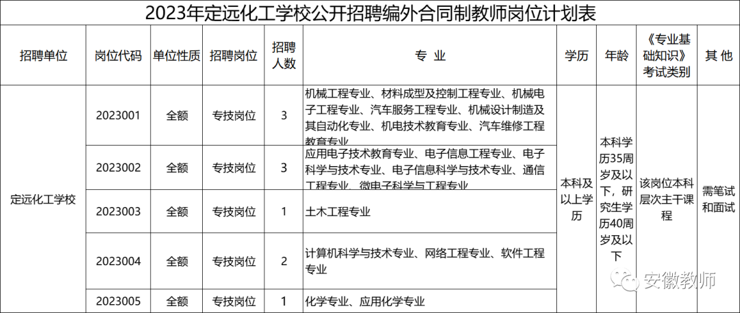 2023年定远县化工学校公开招聘编外合同制教师10名。(详见附件1:《2023年定远化工学校公开招聘编外合同制教师岗位计划表》)