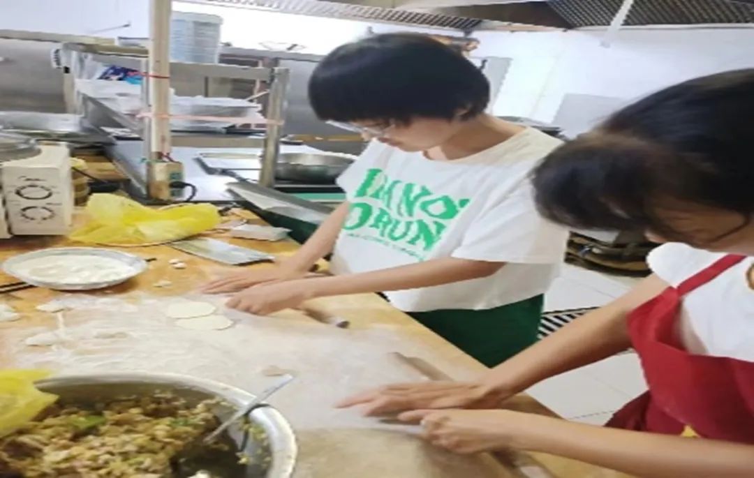 图为实践队员学习擀饺子皮